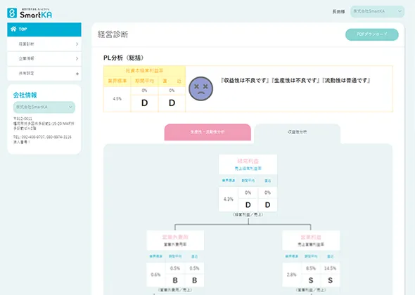経験や勘だけに頼らない、データ駆動型の経営をテクノロジーで支援します。経営診断と決算分析を自動化する自社開発ソフト「SmartKA」を通じて経営の現状をリアルタイムに可視化。数字に基づく意思決定を支える、新しい経営支援の仕組みを提供しています。